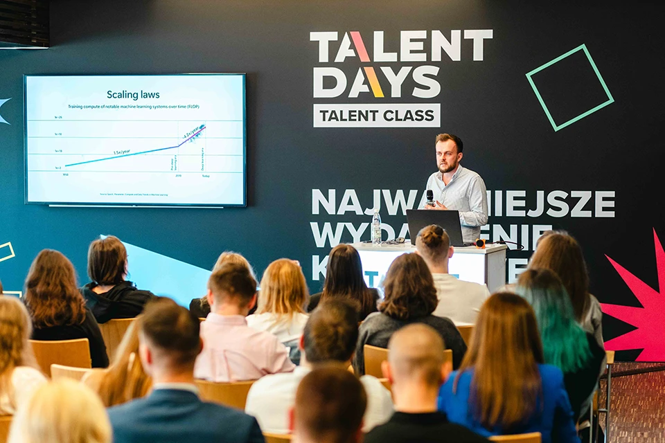 Warsztat AI Talent Days - prelegent prowadzi szkolenie o AI dla uczestników targów pracy